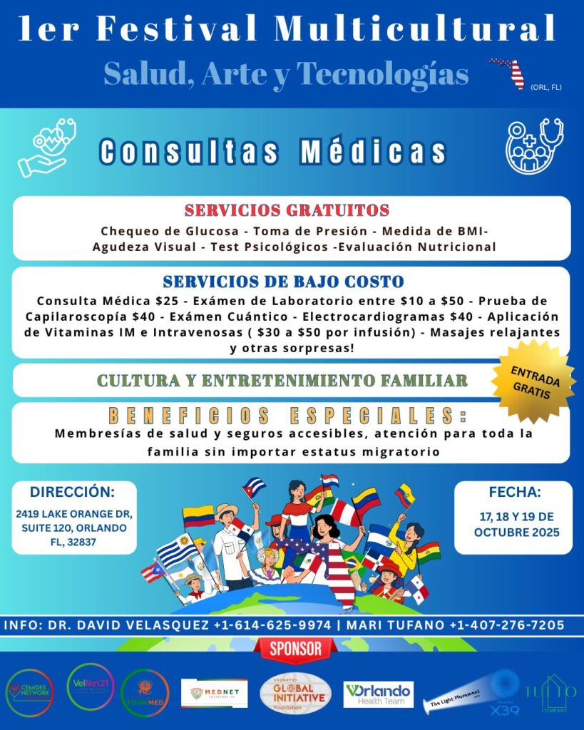 The Multicultural Health Festival, founded by Dr. David A. Velasquez and partner clinics in the U.S. and El Salvador, is dedicated to bringing preventive care, health screenings, and wellness education to underserved communities. Our events offer medical evaluations, blood tests, imaging, physical exams, medications, and family activities—regardless of immigration status. We focus on preventing and managing conditions like diabetes, hypertension, cancer, and obesity, promoting health, culture, and community connection locally and internationally.